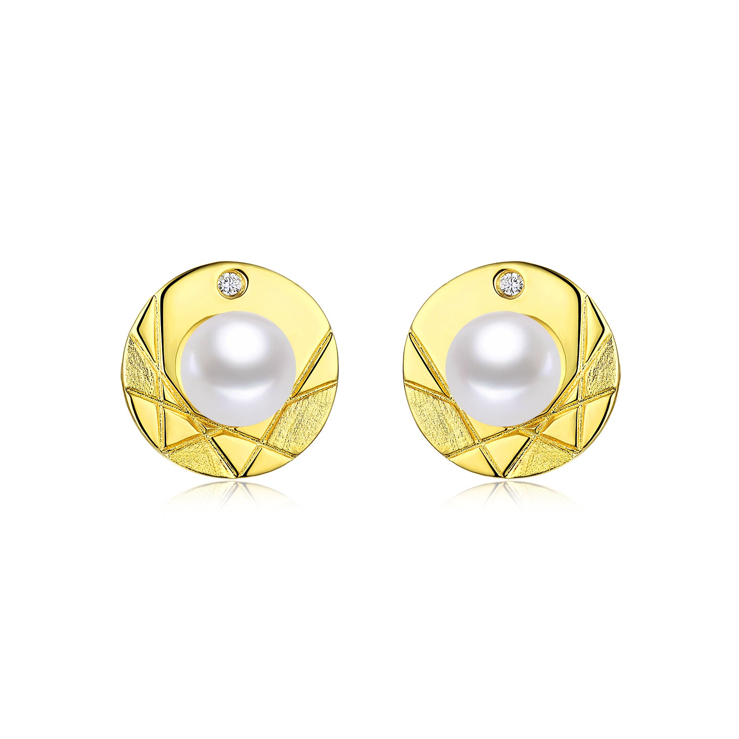 Crafted from premium 925 sterling silver with a luxurious gold plating, the 13mm round earrings feature an intricate hydrangea-inspired geometric texture that adds depth and visual interest to the polished golden finish. At the center sits a lustrous pearl, its soft iridescence beautifully complemented by a tiny sparkling cubic zirconia accent at the top—creating a perfect balance of classic charm and modern detail.