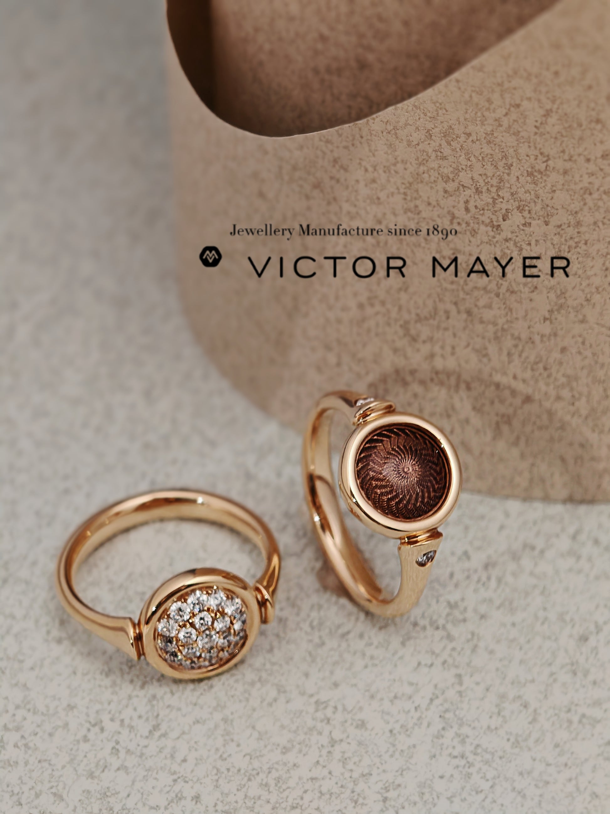 Created by chance: Managing Director Dr. Marcus Oliver Mohr discovered a historical tool in the archives of his great-grandfather, company founder Victor Mayer, from which small, hand-flattering cabochons can be embossed on both sides. Without further ado, he developed it into a modern concept for a refreshingly different collection. “My young designer team has played hard,” smiles Marcus Mohr. “They combine colours, colours, colours – different varieties of rose to trendy red gold or different shades of blue and turquoise to white gold, in between a subtle warm grey and now and then a diamond pavé. The flame guilloché is only visible at second glance, but already at first glance it provides the deep colorfulness that makes the VICTOR MAYER jewelry of all eras so timelessly beautiful.