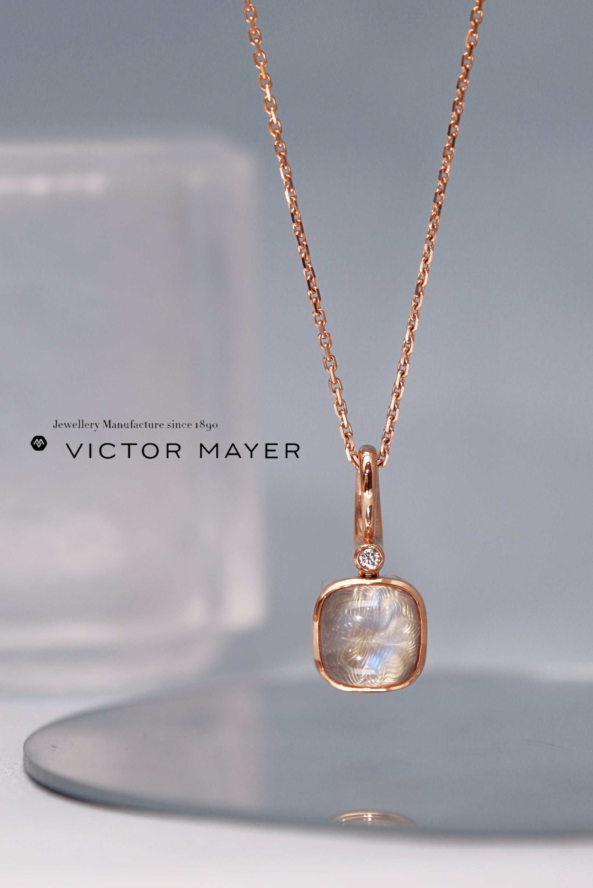 Victor Mayer cushion shaped pendant 18k rose gold, Era collection, 1 diamond 0.04 ct G VS brilliant cut, white moon stone over guilloche disc