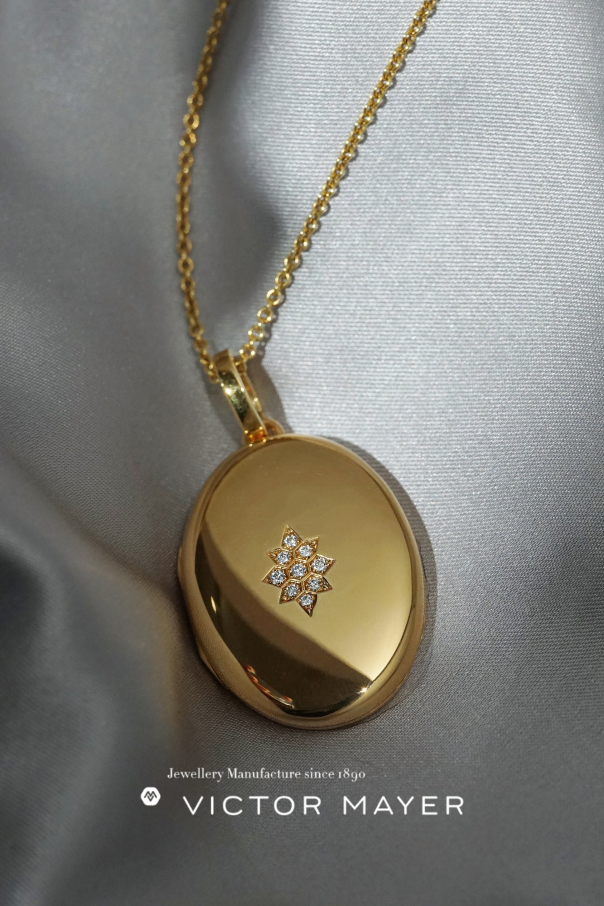 Oval locket pendant necklace 18k yellow gold, with a total of 14 g, particularly heavy and highly valuable manufacture, Victoria Collection, star motif with 9 diamonds total 0.07 ct, G VS, brilliant cut, measurements app. 20.0 mm x 15.0 mm